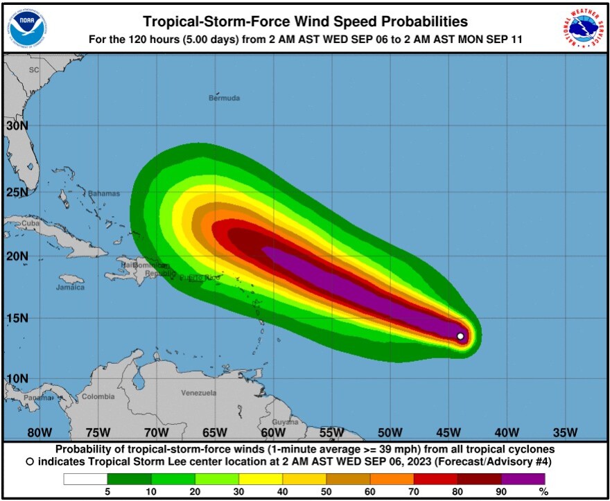 The Hurricane Center has Lee on a path that takes it north of the Leeward Islands, where it is expected to create tropical storm conditions by Saturday. The NHC has not yet forecast a track after that.