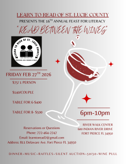 February 27th 2026 is one of Learn to Read of St Lucie County major fundraising events: Feast for Literacy "Read Between the Wines" this will be our 16th Annual event. We will have a one hour cocktail reception, followed by a sit down dinner with live music. The gala will have a Silent Auction, Raffle, 50/50 drawing and Wine Pull as the main features of the night. We expect 100-150 people to attend which include our major donors, sponsors, and Literacy supporters. We are seeking donation to be used for the Auction or Raffle and want to thank you in advance for your consideration of our request for donation. Should you have any questions, suggestions, or concerns, please feel free to contact me at (772) 464-2747.