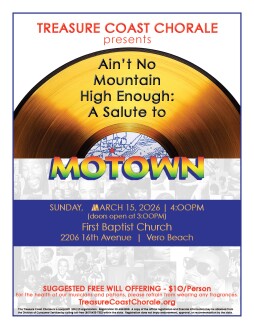 “I Heard it Through the Grapevine” that the Treasure Coast Chorale is presenting “Ain’t No Mountain High Enough: A Salute to Motown” at 4:00 p.m. on Sunday, March 15 at the 1st Baptist Church, 2206 16th Ave., Vero Beach. (Across from the main library.) “Ain’t No Mountain High Enough” that can keep folks from being there!