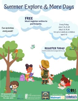During the months of June and July, Heathcote will host eight (8) Fridays as Summer Explore & More Days. Families with children ages 5-12 will REGISTER in advance at www.heathcotebotanicalgardens.org (click on the Explore & More icon) for their designated Friday(s) and in return, the garden admission will be free. Each Friday will have a specific theme accompanied by fun worksheets and or supplies for projects. Topics include Insects & Butterflies, Mind Your Surroundings, Garden Guru, Art, Pioneer Days, Orchid Bee, Oh My Bonsai, and a Scavenger Hunt. There will also be educators on standby for specific topics, questions, and answers. Attend one, two or even all Fridays for fun in this botanical wonder in the heart of Fort Pierce.
