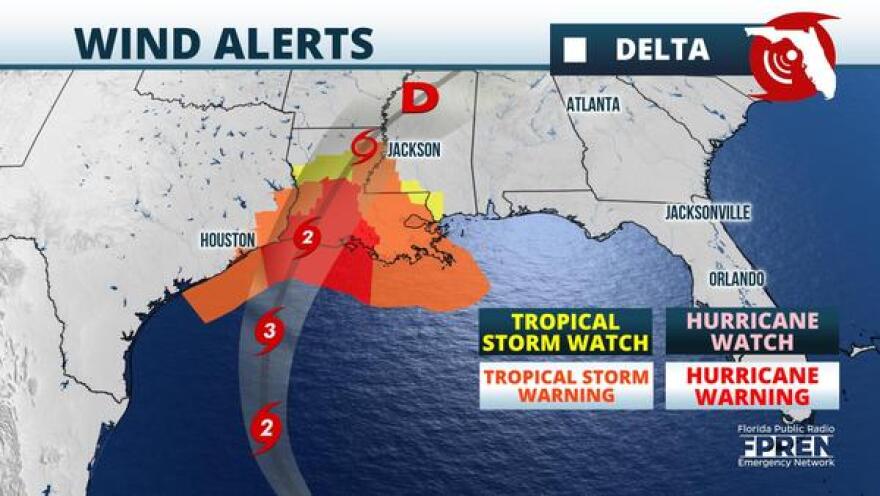 Delta strengthened a little more as of the 11am advisory. Top sustained winds increased to 105 mph, which is a category 2 storm. Delta is still forecast to briefly regain category 3 status early Friday before coming ashore as a category 2 storm late Friday afternoon or Friday evening in south-central or southwest Louisiana.