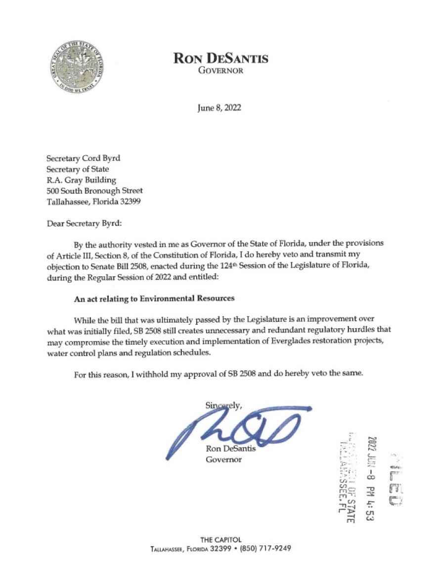 Captain Daniel Andrews of 'Captains for Clean Water' praised the veto saying - "When you look at these record investments that the Governor has put in to Everglades restoration and really prioritized the projects that actually getting the job done. The EAA Reservoir south of Lake Okeechobee to restore the flow the way nature intended. We're confident."