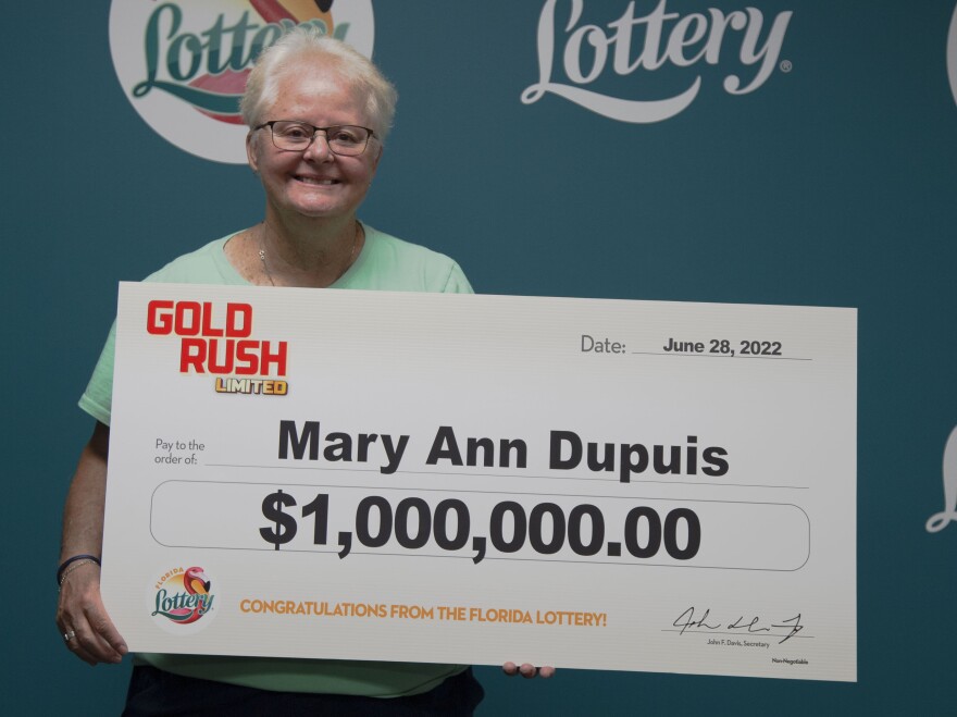 Fort Pierce - Wednesday July 6, 2022: 68 year old Mary Ann Dupuis of Fort Pierce has claimed a $1 million prize from the GOLD RUSH LIMITED Scratch-Off game at Lottery Headquarters. She chose to receive her winnings as a one-time, lump-sum payment of $795,000.