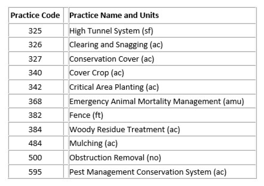 - EQIP conservation practices offered for financial assistance are listed below: