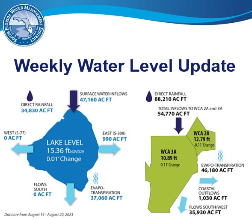 South Florida - Wednesday August 23, 2023: Here are the latest water levels in key south Florida water bodies from data collected between August 14 through August 20. Total volumes are reported in acre feet (AC FT).