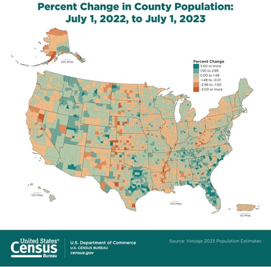 Leading the way was Los Angeles County, with 56,000 fewer residents. Three counties representing the boroughs of Brooklyn, Queens and the Bronx in New York City followed, with population losses of 28,300 people, 26,300 people and 25,300 people, respectively. However, the outflows from these large counties last year were substantially smaller than they were in 2022.