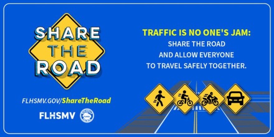 Florida - Monday May 6, 2024: May is Share the Road Month. The Florida Department of Highway Safety and Motor Vehicles (FLHSMV), along with our partners at the Florida Department of Transportation (FDOT), Florida Sheriff's Association (FSA), Florida Police Chief's Association (FPCA), the Florida Trucking Association (FTA), and AAA-The Auto Club Group, want to increase awareness among Florida road users that sharing the road is not only a shared responsibility it is essential for ensuring safe travel for everyone.