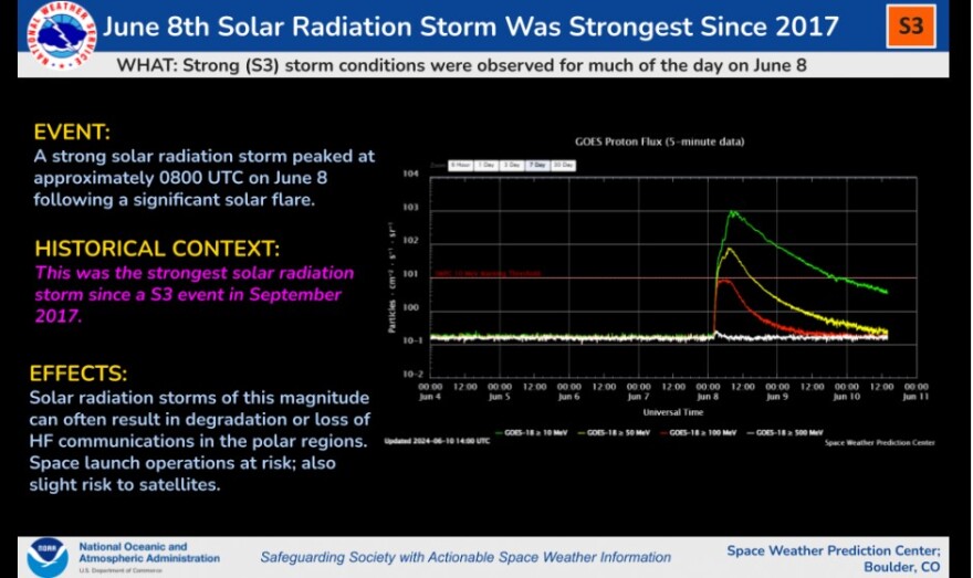 Florida - Tuesday June 11, 2024: NOAA's Space Weather Prediction Center (SWPC) reports that a strong radiation storm on the sun this past Saturday, June 8th, was the strongest solar radiation or "S" storm since September 2017, and the second strongest type of radiation storm on the classification scale.