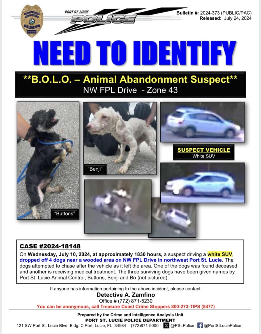 Port St. Lucie - Thursday July 25, 2024: The Port St. Lucie Police Department is asking for the public's help finding the person who abandoned 4 dogs near a wooded area on NW FPL Drive.