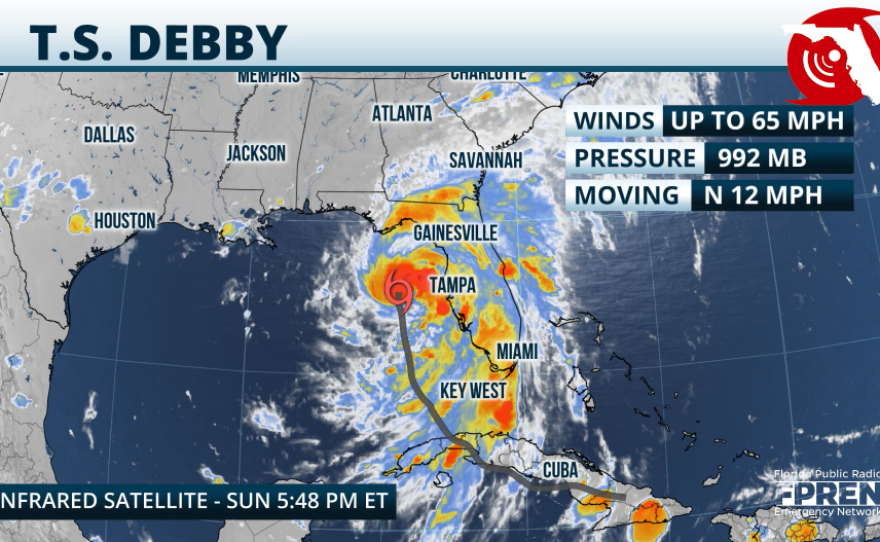 Hurricane Hunters investigated Tropical Storm Debby this afternoon and they did not find winds above 65 mph. Hunters will make another round this evening and continue to measure winds and pressure, among other characteristics to determine if it strengthens tonight. Satellite imagery does show that the core of the system is trying to close, this is a sign of intensification as the eye wall tries to close off and become symmetric. The big concern now is about rapid intensification and how much of this will occur within the next 12 hours or so before making landfall near the northern portion of the Big Bend in Florida Monday morning.