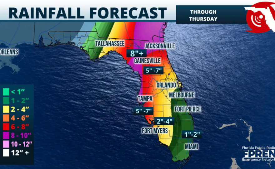 Esta tormenta, independientemente de la intensificación, será un gran evento de lluvia. Habrá vientos significativos en el norte de Florida, con fuerza de huracán, pero se espera que el sistema se degrade a tormenta tropical una vez que se mueva sobre el estado y continúe arrastrándose por el sur de Georgia y Carolina del Sur. La velocidad de avance disminuirá rápidamente y probablemente se moverá a aproximadamente 5 mph. El mayor riesgo de inundaciones repentinas será en Big Bend y el norte de Florida, donde hay algunas áreas donde podrían caer hasta 12 pulgadas.