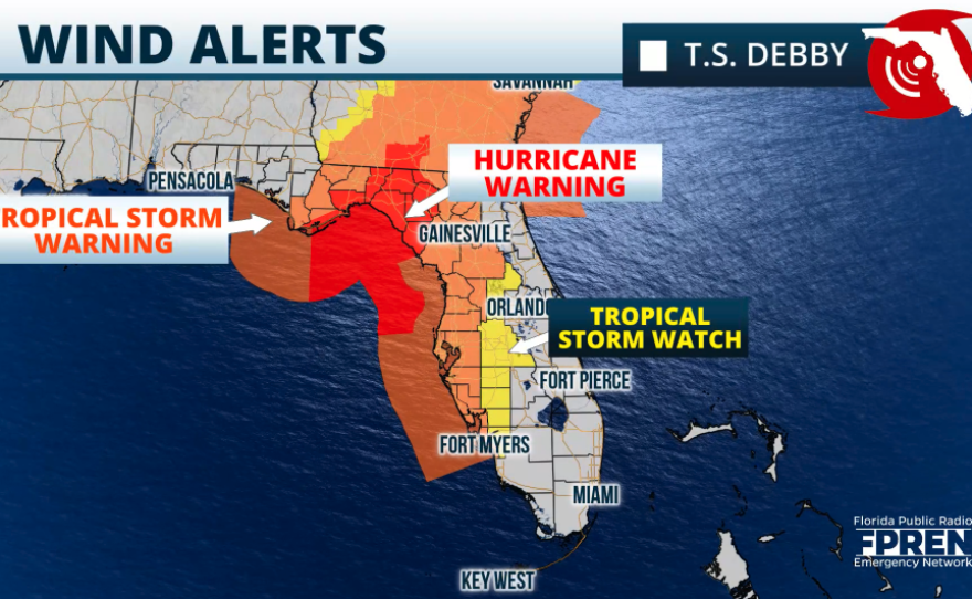 Debby es una tormenta masiva y la pendiente del fondo del océano (la batimetría) sobre la costa oeste no son pronunciadas. Esto permite que un sistema grande empuje más agua hacia el interior. La marejada ciclónica será extremadamente peligrosa en Big Bend y el resto de la costa oeste de Florida a medida que la tormenta continúa intensificándose y avanzando hacia el norte. Es posible que haya una marejada de dos a cuatro pies a lo largo de la costa central oeste de Florida hacia el sur a través de Bonita Beach. Una marejada ciclónica potencialmente mortal a lo largo de la región de Big Bend y al este de donde la tormenta toque tierra. No se pronostican marejadas ciclónicas de 6 a 10 pies desde el río Aucilla hasta la parte norte de Big Bend.